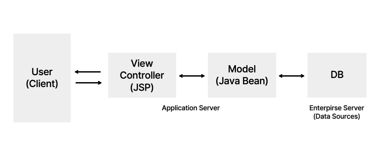 - MVC1 패턴은 View와 Controller를 모두 JSP가 담당하는 형태이다.